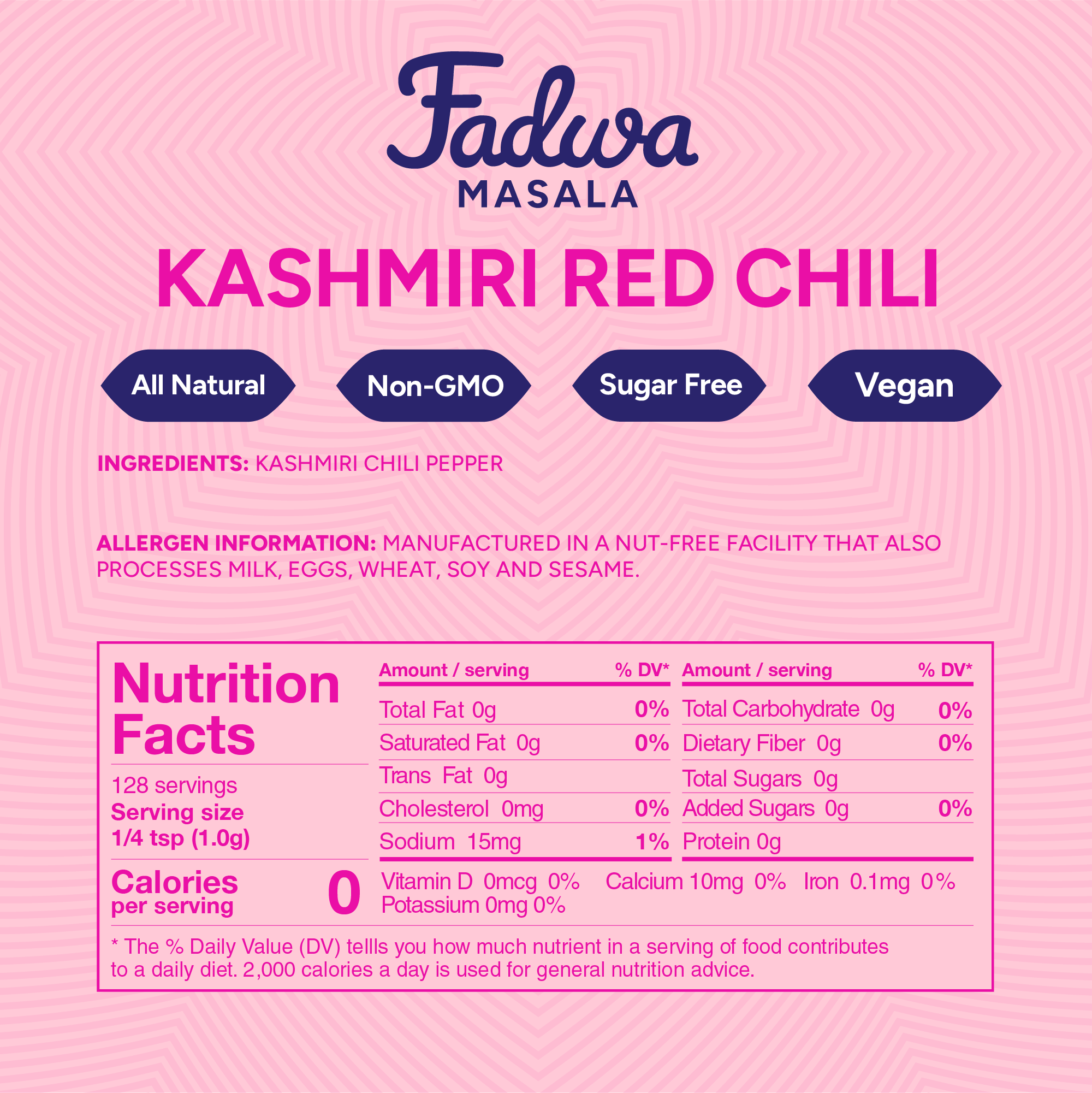 Add vibrant red color and gentle warmth to your favorite South Asian dishes. Our Kashmiri Red Chili Powder is finely ground from high-quality chilies for a naturally bold hue—no artificial dyes needed. It blends seamlessly with any Fadwa Masala blend and our Pakistani Pink Salt for effortless, authentic Desi meals at home.
