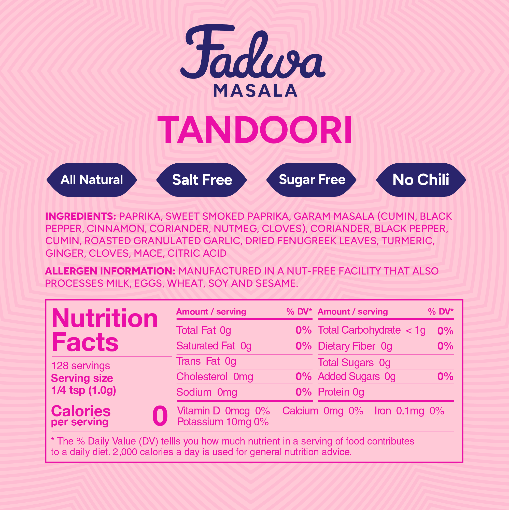Paprika, Sweet Smoked Paprika, Garam Masala (Cumin, Black Pepper, Cinnamon, Coriander, Nutmeg, Cloves), Coriander, Black Pepper, Cumin, Roasted Granulated Garlic, Dried Fenugreek Leaves, Turmeric, Ginger, Cloves, Mace, Citric Acid